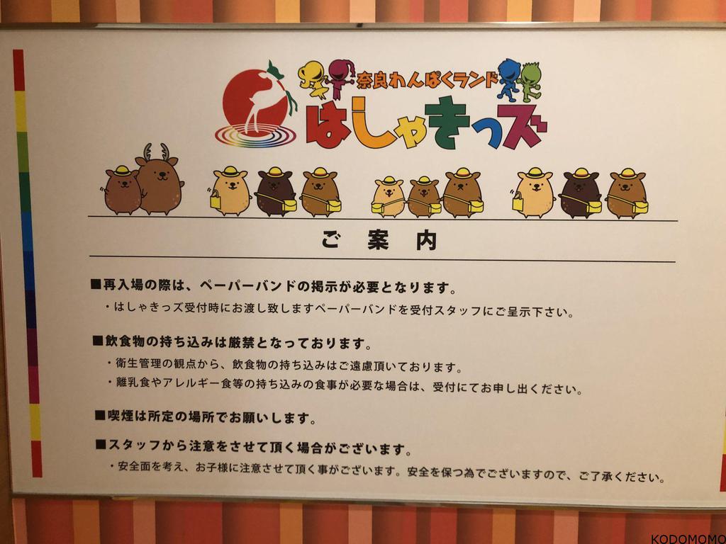 奈良プラザホテル宿泊者で1日目にはしゃキッズに入場した場合同日は再入場可能ですが翌日は再入場不可。